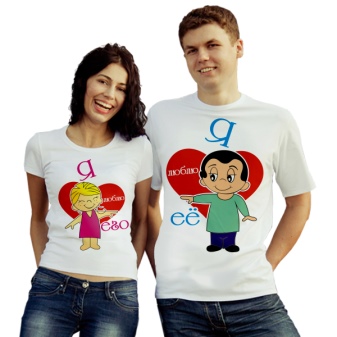 In addition to inscriptions and hearts on personalized T-shirts for lovers, they often depict funny schematic silhouettes of a guy and a girl, as well as famous pair characters from comics and cartoons (for example, a couple with Love is chewing gum inserts ...).