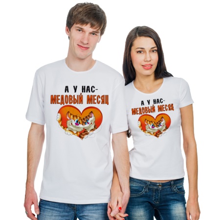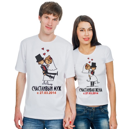 In such t-shirts, couples sometimes appear on the second day of the wedding or spend a honeymoon in them.