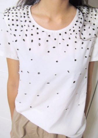 - With rhinestones and sequins. Rhinestones are a whimsical accessory, so you need to carefully iron the t-shirt from the wrong side, then the front part is steamed.