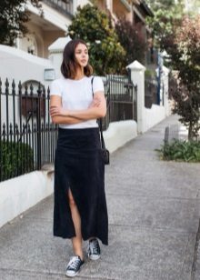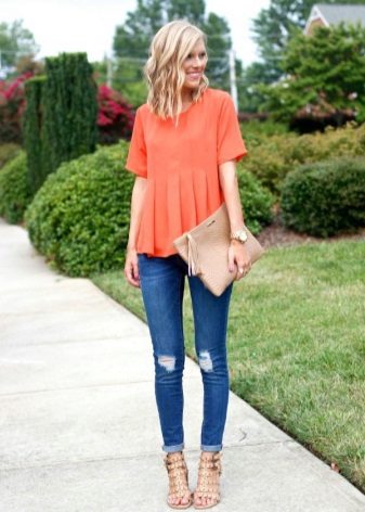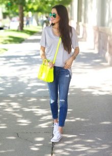 - Shoes for a set of clothes, including a plain t-shirt, are selected taking into account the created image. If the t-shirt is part of a business style, opt for sandals with a closed nose or graceful boats. For a walk, you can choose ballet shoes, slip-on shoes, sandals, moccasins or sneakers.
