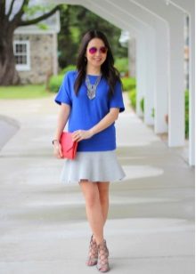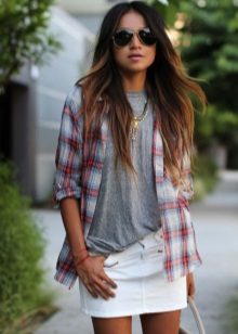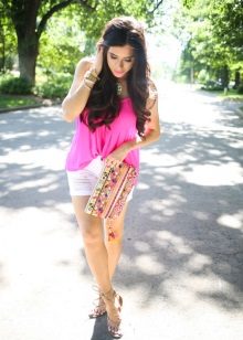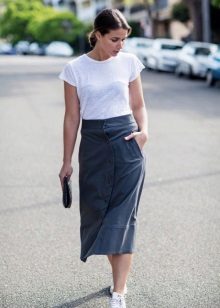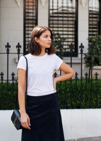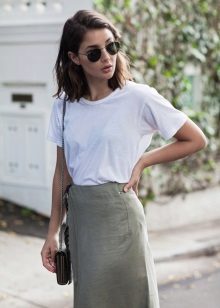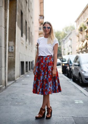 - A good companion to a plain t-shirt will be a skirt decorated with floral and vegetable print. Such an ensemble looks romantic and feminine.