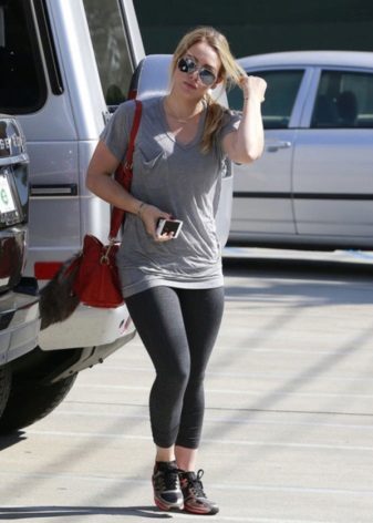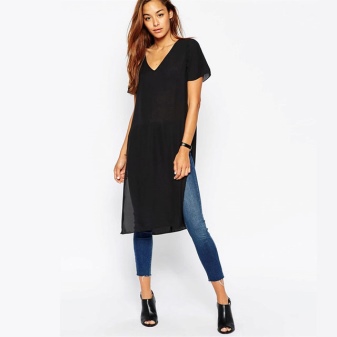 - A long t-shirt in plain color should be combined with tight jeans or leggings. Young slim beauties can wear a T-shirt such as a dress, putting on tight tights under it if desired.