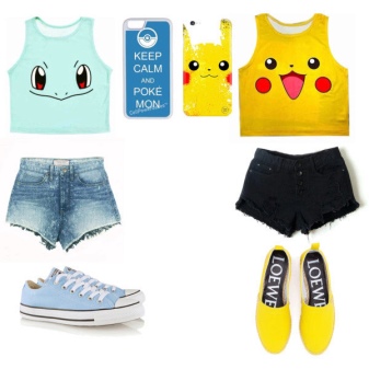 Since combining a T-shirt will work with any suitable clothes, the shoes can be used differently. From sneakers to platform shoes. Not only ordinary bags, but also clutches and backpacks will suit the image with a t-shirt. The main thing is not to exaggerate with accessories, since the print with Pokemon is already bright, and in combination with other colorful objects can create an unnecessary sloppiness.