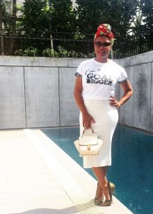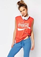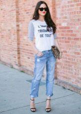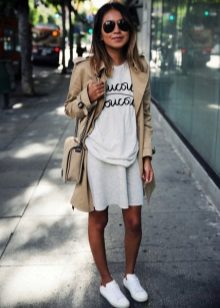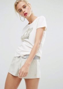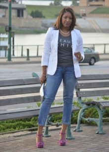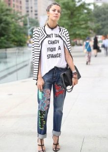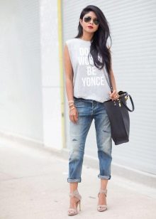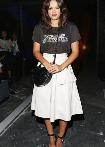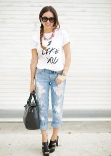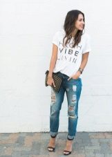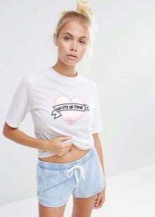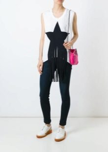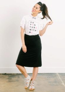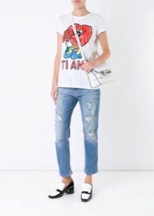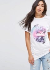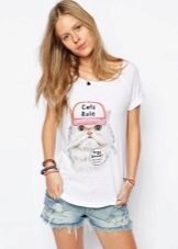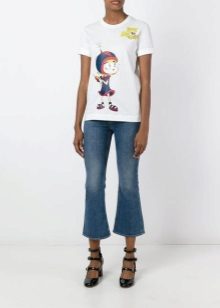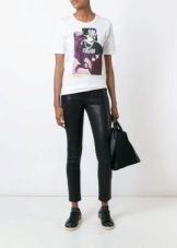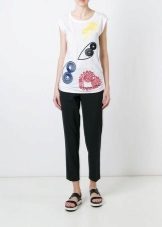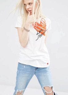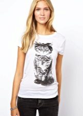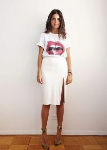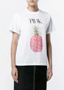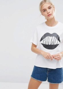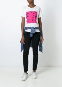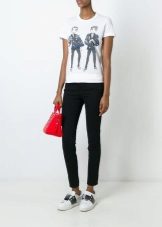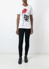 White T-shirts with inscriptions or prints are indispensable in the wardrobe of a modern fashionista. It will complement any everyday look; they can be worn at a party, at a club or on a date. She looks very concise and stylish, but a bright print adds a twist to the image.