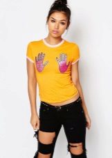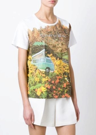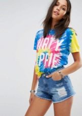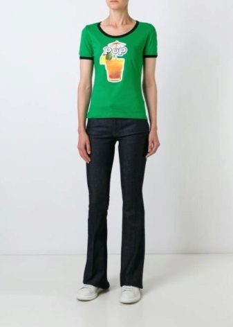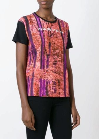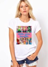 Multi-colored. In addition to basic neutral t-shirts, multi-colored T-shirts with interesting prints are also in demand. They are more binding, so not every fashionista decides to include them in her wardrobe. Wear them best with sleek skirts or jeans. As for color, give preference to blue, pink, green or yellow. They look bright and interesting.