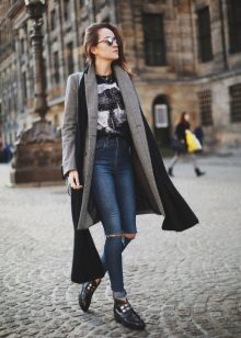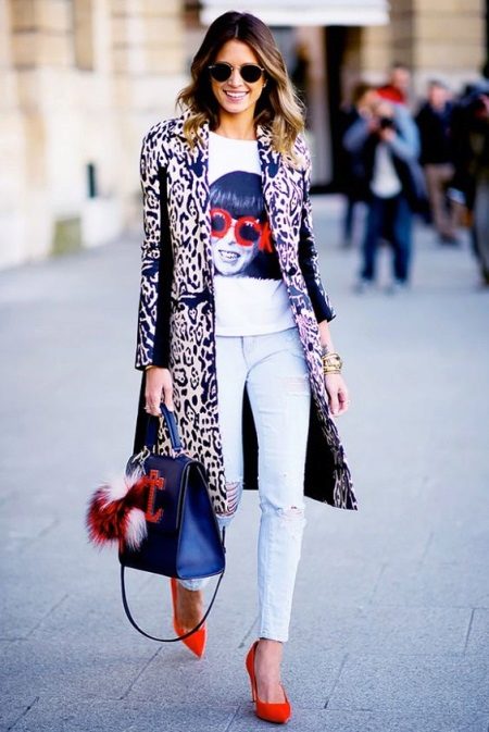 - A fashionable look for work that creative girls will love. Light skinny, white portrait T-shirt and a long coat jacket with animal print. The image is complemented by a stylish bag with fur trinkets and red boats. Red color helps to emphasize the image, we also see it on a T-shirt and bag.