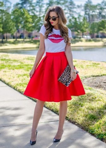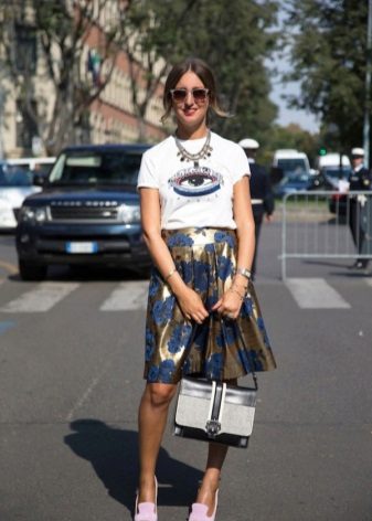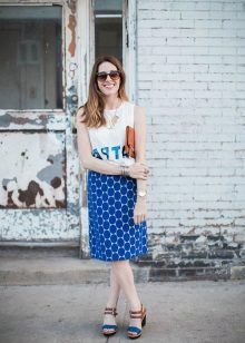 - If you go on a date, look at this gentle and feminine image. A simple white T-shirt with the inscription, a floral midi skirt, a white handbag and berry lace-up sandals. The image is complemented by sunglasses. You will look perfect!