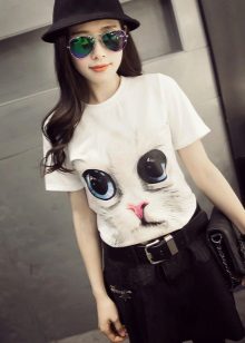 Drawings of a mystical black cat, eyes or muzzle of a cat, images of kittens or a feline couple are popular. Since modern technology allows you to apply 3D images, volumetric photos of fluffy cats on a T-shirt look especially impressive.