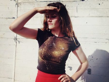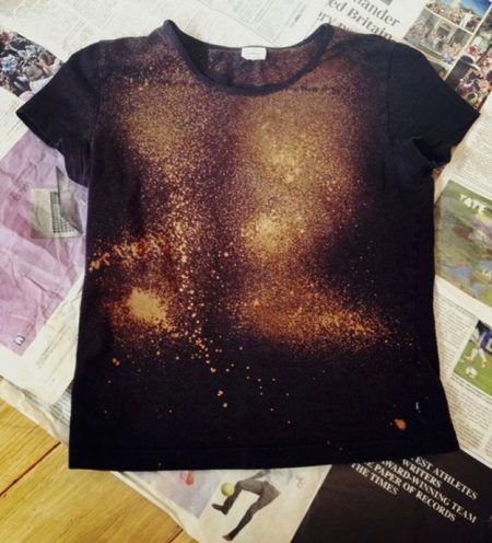 For a galactic print, you will need not a white, but a black t-shirt. Also take bleach, metallic dyes, a brush and an empty spray bottle.