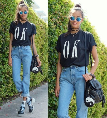 - Stylish and at the same time concise look for every day. Blue mom-jeans, a black T-shirt with the inscription, rubber sandals on a tractor sole. Details are added to the image: print socks, several chokers on the neck, bracelets and sunglasses.