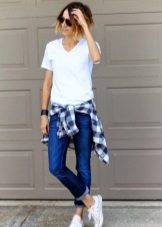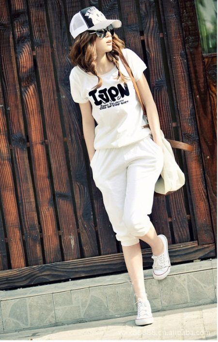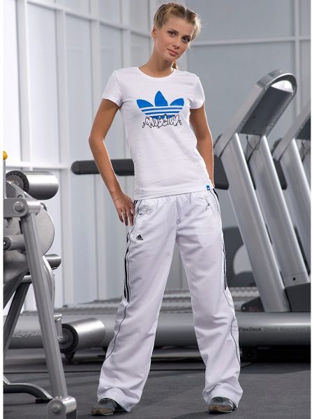 If a T-shirt is part of sports equipment, then the rest of the clothing should be appropriate: sweatpants, tights, leggings, bicycles, shorts. As shoes, you can choose sneakers or sneakers.