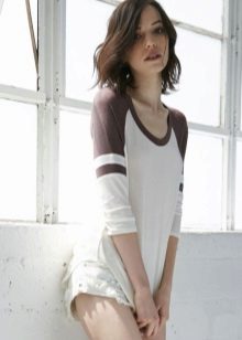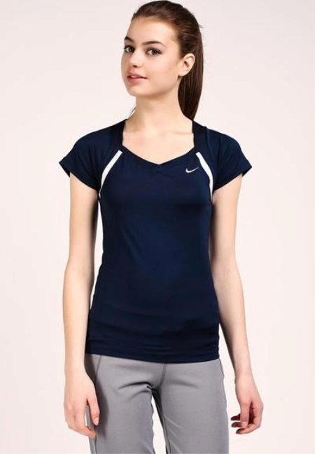 Sports t-shirts are perfectly combined with jeans of different styles, sports models of trousers, flared or trapezoidal skirts. Such a T-shirt can also be worn under a sundress.