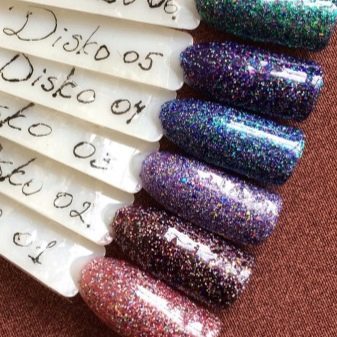 - Colored gel polishes. The manufacturer divided these products into two lines. Basic: enamel and pearlescent varnishes of various shades are collected here. Disco: This line is represented by gel polishes with glitter. A great option for parties and going to a night club.