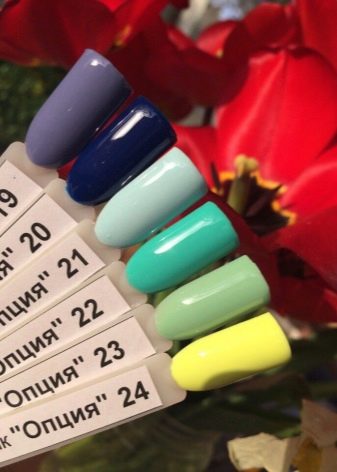Colored gel varnishes of TM “Option” are represented by a fairly wide palette of shades and colors.