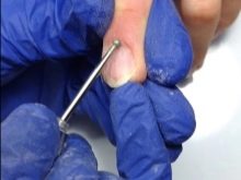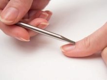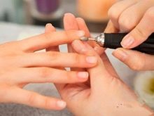 It is advisable to use hardware here. Push the cuticle off with a pusher. With a “candle” milling cutter, it is good to remove pterygium, to clean all the recesses under the skin.Cut the cuticle with the “ball” nozzle. Sand the surface of the skin. Give the nails the same shape and length.