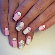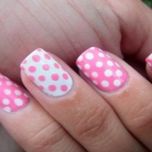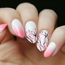 Pink with white is a combination for young fashionistas, since such a design is full of tenderness and freshness. A sakura branch on a white substrate will perfectly cheer you up in spring. Pink and white polka dot nails - why not if you're not twenty. Lunar manicure for older people.
