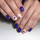 It will be interesting to look at a manicure with patterns of black, brown, red and blue shades on a blue background. The accents of a cream, white or yellow-green shade on a blue base will look modest and gentle.