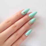 - Spanish nail art technique. As the basis for Spanish manicure, milky matte varnish is used, and the top layer is a bright glossy finish, for example, turquoise. Most often, the coating is applied not entirely, but in the form of strips. As a small addition, you can use decorative elements. It will be enough to single out one nail.