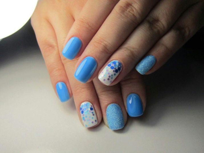 Spangles in manicure are always a claim to a festive look. For the decor of a blue background, you can use a shimmer, that is, diffused soft radiance or glitter (rather large sparkles), cover the entire plate or selectively, in zones. For bolder natures, it is recommended to use multi-colored kamifubuki.