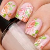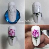 An interesting version of manicure is when one large flower, as it were, consists of two halves, drawn on adjacent fingers. In this case, the halves do not need to be symmetrical, natural naturalness in the image is welcomed. In a wet way it is possible to draw not only roses, but also other flowers: lilies, orchids, sakura. This nail art harmoniously combines with almost all techniques from amber and lace design to rub and broken glass. The technique of “raindrops” will give great naturalness to the drawing. With its help, the effect of fresh dew that has fallen on the petals of the opening flower is created.