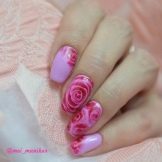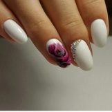 The design of roses in a classic naturalistic image allows for bright and rich colors. Monograms, lace and rhinestones look good in addition to such a pattern. Flowers are performed in red, white or dark colors with saturated greens. Background you can choose white, black, purple or chocolate. Gilding and metallic rubbing will also be appropriate in this version of nail art.