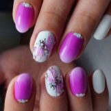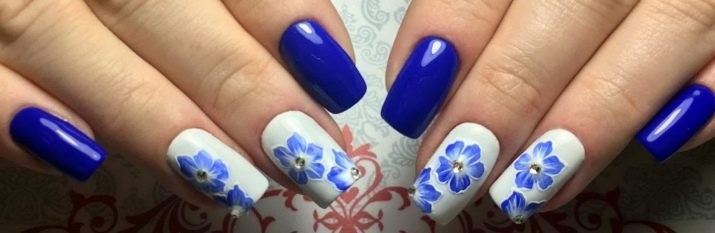 With the help of flowers, you can complement your standard one-color manicure or familiar jacket. In this case, the pattern is placed on the side of the nail or a strip is formed at the end of the nail with its help. You can supplement such a manicure with the allocation of a lunula or small accents from rhinestones. A richer and lush design can be used on accented nails. At the same time, a matting top is often used to create a fashionable velvet effect.