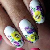 Flowers on nails with gel polish are created in various ways. Craftswomen with experience use painting with the finest brushes and dots. Now in fashion, different color options and compositions.There are many special gel coatings that help to carry out various techniques: Chinese painting, flowers in delicate lilies, stained glass effect, volumetric design with icing sugar, 3d gel, sweet bloom technique, screen painting and, of course, the popular wet painting option gel polish.