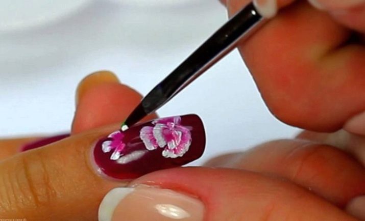 As a rule, they draw patterns on a gel well dried under a UV lamp. This technique is characterized by the fact that it uses an uncoated coating. In this case, the first base layer is dried in the usual manner. But the finest second layer applied to it is left without solidification. According to it, they make painting with a companion varnish, and only after the drawing spreads it is immediately fixed.