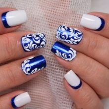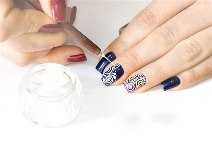 The most common remedy is varnish. It is affordable, diverse, easy to use. To create a simple design, you need only two shades - for the background and for the pattern. The downside is the dense texture of gel polish, which causes difficulties for beginners in reproducing thin and small patterns. But actually this is a matter of technology, it needs to be developed.