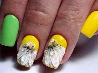 - Then proceed to create a camomile pattern. With the help of dots or ordinary toothpicks, yellow drops are applied at the locations of the daisies: one on the little finger and index finger, two on the middle and ring fingers. Typically, the pattern is arranged symmetrically. Therefore, on two fingers on the hand, daisies will be to the left of the center, on the other two to the right.