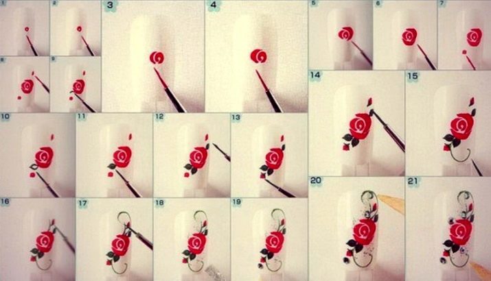 To reproduce a high-quality rose is not obtained by all masters. But the simplest sketch can be done even with your own hands. To do this, you need a dot brush or a short liner. We start to draw a rose from the center. Dip the very tip of the brush into the varnish and, holding it vertically, put a point, and draw a comma from it. The next arcuate line is twisted in the other direction. And so in a circle several times, increasing the length of the arcs. That's all.