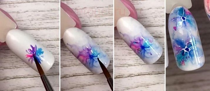 Flowers are sometimes painted not on a dried basis, but on a “wet” layer. In this case, the background does not dry out, it immediately begins to work in a different shade. Drops are applied at the locations of the petals and are gradually stretched with a needle, toothpick or thin brush. It turns out a kind of watercolor effect, because the gel polish spreads.
