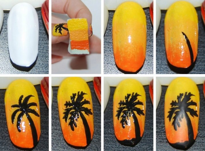 There is nothing complicated in drawing a palm tree. Any thin brush is required. The drawing begins with drawing the trunk from the hole in the nail plate. The line should turn out with a thickening from below, thinner from above and with an inclination. Then a drop of varnish is applied to the top and palm leaves are pulled from it in different directions. Usually from 4 to 5 pieces. The serrated edge is best drawn with a needle or with skills with the tip of a brush.