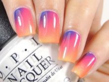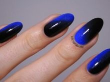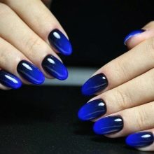 - Ombre. There are several options for creating such a nail art. Before applying the main coating, the nails should be well processed. A high-quality “base” is taken, which covers all the nail plates. The layer dries well in a lamp. After that, 2 colors of the selected shellac are applied to the nail plate. The border between them should be carefully and slowly shaded with a fan-shaped brush. Or a piece of foil is taken, on which are placed 2 drops of shellac of different colors nearby. The border between them is slightly shaded with a toothpick. Now a sponge is taken, dipped in varnish, which is transferred to the surface of the nails.