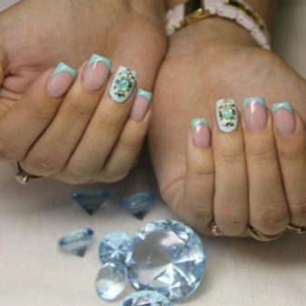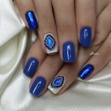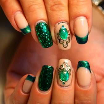 - Liquid stones. This manicure will look rich and fresh. Shining “gems” can be fixed on the nails: “sapphires”, “rubies”, etc. Casting with transfer foil is used as a frame. This option can be used not only for dates and luxury parties, but also when you want to bring to life something special, bright and fun.
