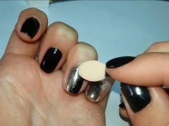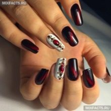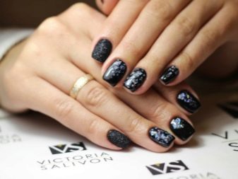 - Rubbing. You can create a bright and attractive manicure using a rub. You should purchase high-quality materials and tools to implement the idea. A “base” is applied and it is well dried under an ultraviolet lamp. After that, shellac is taken (preferably a darker shade), which covers the nails. After the layer dries out a little, you should take it gently and rub small sparkles into the surface with gentle movements.