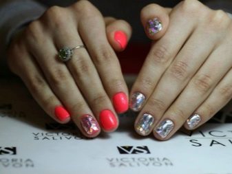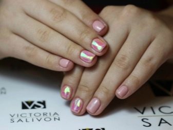 - Broken glass. Modern girls love this technique for simplicity and effectiveness. To implement the decor you will need a special foil, which is sold in any professional store. With the help of scissors, pieces of material are cut that are applied to the nail plates. So you can create various masterpieces, geometric paintings, highlight a glossy surface. The foil has a tone suitable for the main coating, or painted in contrasting shades. Business style fans can use pastel and cream shades.