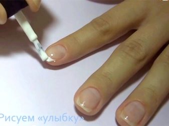 - French manicure. Nail plates are prepared for coating, they are carefully treated, cuticles are removed, and the surface is buffed. After all the procedures, the base coat is applied to the nails. It will provide better adhesion of the surface of the nail with shellac. Dry nails in a UV lamp. Then you need to take white shellac and draw a smile area. It can be either standard or beveled or can have various geometric shapes. The layer polymerizes in the lamp. After that, shellac is applied in nude shades, and again the nails are dried. Novice professionals can use special strips to create an even smile line. So you can easily create a stylish manicure.