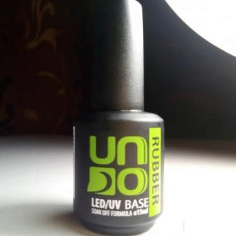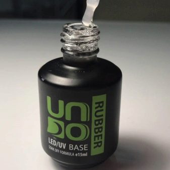 - UNO Rubber Base. This product has a self-leveling effect. The manufacturer is a well-known company UNO. This base should be used for weakened and brittle nails. When using it, there is no need to use a primer. This tool is viscous and thick, and thanks to the soluble formula it can be removed without the use of grinders and files that cause mechanical damage to the nail plate. The manufacturer produces this product in 15 ml bottles. It is presented with a convenient brush, which consists of short setae. The polymerization process of the coating is carried out from 30 seconds to several minutes, depending on the selected lamp.
