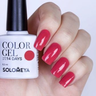 - Solomeya. This gel polish is characterized by excellent composition, which includes natural ingredients. The manufacturer does not use harmful solvents, dyes or synthetic resins. This tool is characterized by increased resistance due to the polymer structure. It is easy to apply and the coating is resistant to various external influences. The only drawback is that you should unscrew the bottle to see the color of the gel polish.