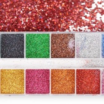 - Glitter - large and small, in the form of hearts, stars, hexagons, circles, metallized and ordinary, rainbow.
