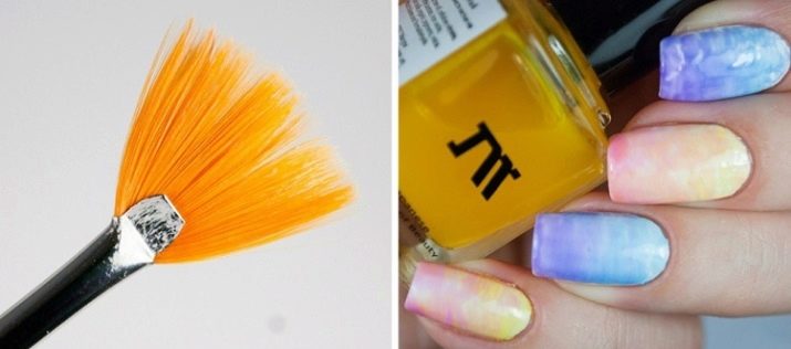 - Fan brush has several functions. The bristles at its base are located in the form of a fan, which makes it possible to apply several tones at once, covering the entire plane of the nail with one movement. A similar technique is practiced for abstract coloring and smooth flowing from one tone to another.In order to obtain such an effect, one drop of varnish of various colors is applied to the palette and all this is mixed with a brush. Also, using it, you can apply rhinestones, sparkles and other small details of the decor.