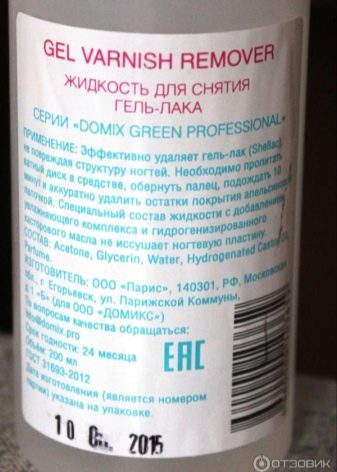 - "Domix GEL Varnish Remover" - This remover has an optimally balanced composition of the solvents used, so it does not harm the nails. The presence of castor oil additionally cares for the stratum corneum and gives a delicate aroma to the composition.