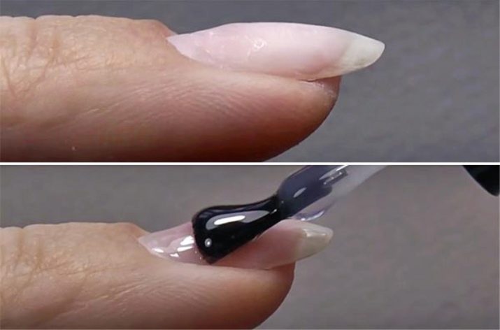 - Using a black tint or other highly pigmented tones of gel polish, it is necessary to apply it with a very thin layer, gently brushing the nail plate.
