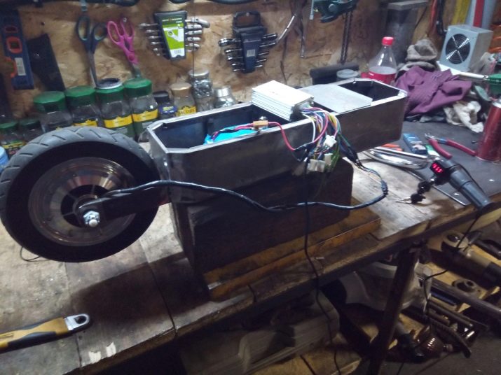 After the metal fork is cut, welded and ground, a bracket is installed on it with bolts and nuts. Wherein it is necessary to provide voltage to the brushless motor - without a controller, your scooter will remain ordinary, not electric.In terms of power, the controller must match the engine. Most often, it is mounted on the rear plug, which means that you need to lay the wiring along the frame to the gas handle, while the wires are usually fixed with plastic mounts. In a convenient place, plug the charger connector into the system.