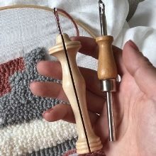 The tapestry needle for creating loops resembles an awl in shape with a plastic or wooden handle. The needle is inserted into the bottom of the handle and secured with a special screw lock. The same clamp adjusts the length of the needle. The loop length depends on this indicator. Usually 2.5-3 cm. There is a hole for the thread on the tip. Some manufacturers produce needles fixed in the handle stationary. The size of the needle is not adjustable, and the loops on the front side are uneven lengths.But this fact does not impair the quality of the tapestry. The hinges on the front of the work are trimmed with scissors.