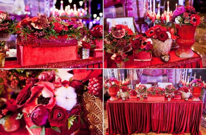 Red color may be the decor of the hall where the celebration takes place. Tablecloths of a luxurious wine hue, balls filled with helium of bronze and red colors. Vases with miniature bouquets and a composition of pomegranates. Creatively make photo collages on the walls, combining together the happiest moments of life together.
