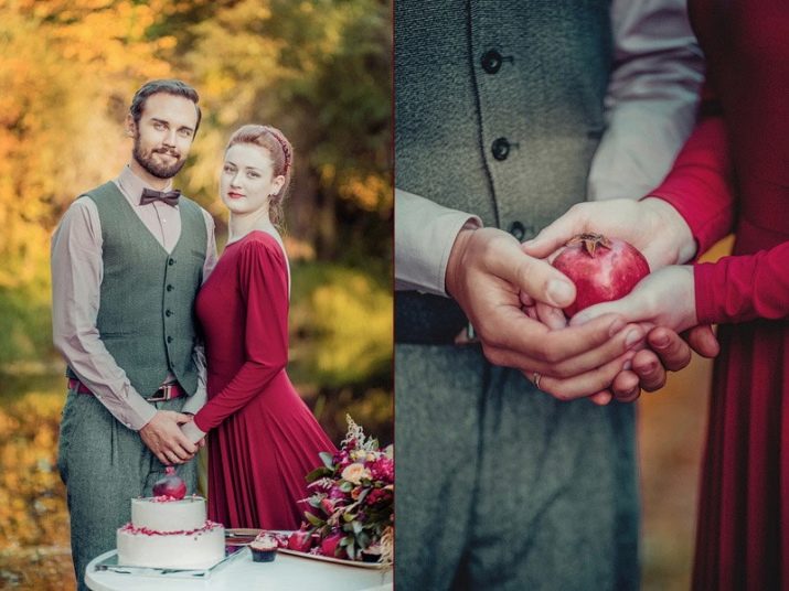 By the way, invitations should be issued according to the date. The main color of the wedding palette is burgundy tone, the color of juicy pomegranate. It is effectively combined with gold and noble bronze. It is not necessary to draw fruits on postcards, but the scattering of grains will look spectacular and will remind guests of why the celebration was started.