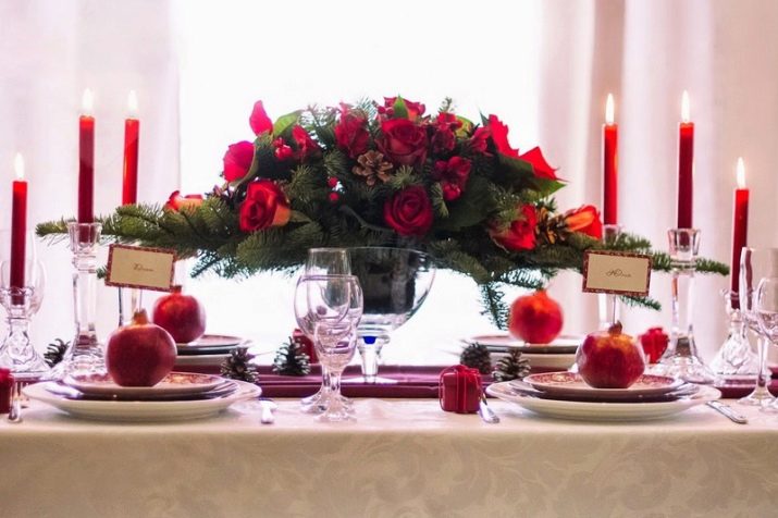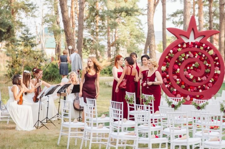 The guests can comfortably accommodate the cards. They can be effectively thrust into the fruits of pomegranate, placing the fruit directly on the table, on snow-white napkins. To make fruit an accent of festive decoration is a great idea. At the festive banquet, a dress code will be appropriate. Guests will be invited to put on dresses in red shades, ideally a rich burgundy, matching the color of the main fruit of the event.