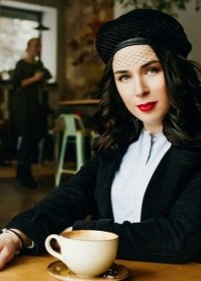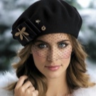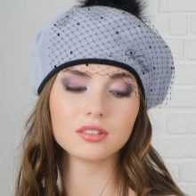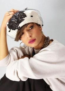 - Beret with a veil (or simply “pill”) refers to evening hats - in the bow of a modern girl this option can become a real highlight that will effectively refresh the whole image. This variety of berets has a sophisticated shape, made of thin and dense natural materials and is necessarily decorated with a veil, which can hide your eyes or simply decorate the product.